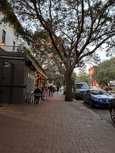 It is starting to get dark in Savannah. The sky is changing to a milky blue above the old trees in Madison Square. The city feels moody and atmospheric. I wander around Madison Square in my favourite part of the historic downtown taking photos and smiling. The light is fading and changing the shape of shadows. Tree limbs form different canopies overhead as the glow from the lamps and leaves scattered all over bring me into an Autumnal mood. It is a mystifying vibe, seemingly on the edge of something, like an entrance into faerie might be at that lamppost.
